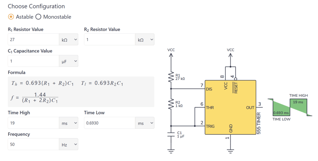 To choose values for the first 555 timer, you need to start with the specs of your servo. My servo, the SG90, needs a frequency of 50 Hz. And you control it’s position by adjusting the time on between 1 and 2 ms.